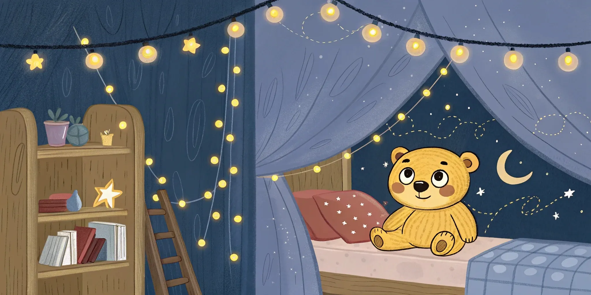 Once upon a twilight, in a snug little bedroom where dreams were just beginning to stir, there lived a cheerful teddy bear named Teddy. Every evening, when the sky turned soft and blue into gentle shades of purple and pink, Teddy's heart would fill with a special kind of wonder. Tonight was different—Teddy felt a tiny spark of adventure calling him outside.